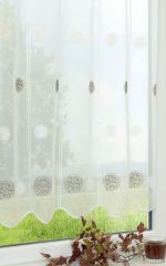 Die Basis dieser ausgesprochen reduziert gestalteten Bistrogardine ist ein feiner, transparenter Polyesterstoff, den wollknäuelartige Gebilde in verschiedenen Farben zieren. Während die Elemente in drei Farben gleichmäßig auf der Länge der Rapporte verteilt sind, findet sich das Trio gebündelt am unteren Abschluss erneut wieder. Der obere Abschluss, in welchem sich auch der Stangendurchzug befindet, ist mit breiten Bögen gestaltet; der untere Abschluss verläuft wellenförmig. Durch das transparente Gewebe kommt viel Licht hindurch; im Kinderzimmer kann das Modell durch das verspielt anmutende Design ebenfalls Verwendung finden. Unter Berücksichtigung des Rapports von 16 cm haben Sie bei der Scheibengardine verschiedene Standardgrößen zur Auswahl. Für die Reinigung des Gewebes empfiehlt sich der Schonwaschgang bei 30 Grad.