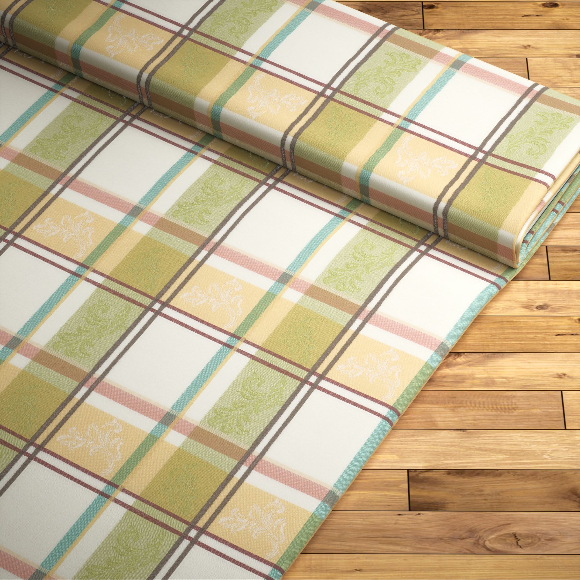 Die zartgrünen, weißen und hellgelben Felder nehmen den größten Teil der Fläche ein. Sie bilden den Hintergrund für die floralen Stickereien, die sich jeweils dezent von diesem abheben. Abgegrenzt werden die Felder durch Linien in Gelb, Petrolblau, Dunkelrot und Rotviolett, die sich wirkungsvoll und kontraststark von dem Hintergrund unterscheiden und dem ganzen Design eine moderne Note geben. Indem Sie in der Deko Farben des Stoffes aufgreifen, wirkt der gesamte Raum einladend und harmonisch.