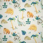 Haminasaurier, tropische Blätter, große Palmen. Das fantasievolle Design bringt Sie in eine andere Welt. Ins Zimmer der Kleinen passt es jedoch besonders gut. Die sanftmütigen Pflanzenfresser, die genüsslich ihre Blätter verspeisen, leben friedlich mit den ungestümen Fleischfressern nebeneinander her und erfreuen sich der Natur. Von dem hellen Stoff heben sich die Motive ausdrucksstark ab. Das lichtdurchlässige Polyestergewebe mit Transferdruck kann viele Formen annehmen, unter anderem die eines Raffrollos oder Gardinenschals nach Maß. Am Fenster befestigt lässt der Behang mildes Licht hindurch, neugierige Blicke jedoch nicht. Der zuverlässige Sichtschutz ist tagsüber wie abends gleichermaßen gegeben. Damit Sie auch die Möglichkeit haben, Accessoires für Ihr Zuhause selbst zu schneidern, bieten wir den Stoff zudem als Meterware an.