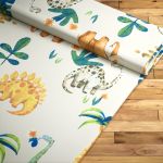 Der cremefarbene Hintergrund erinnert an feinen Sand, dazu die grün-orangen Palmen: Es ist fast ein tropisches Flair, das entsteht, wenn diese Farben aufeinandertreffen. Die Dinos sind unterschiedlich gestaltet, mal in leuchtendem Gelborange, mal eher gediegen in Blau und Braun. Die Farbgebung wurde offensichtlich an den Charakter der Tiere angepasst. Naturfarben und weitere Grüntöne sowie viele Zimmerpflanzen setzen das Design perfekt in Szene.