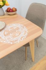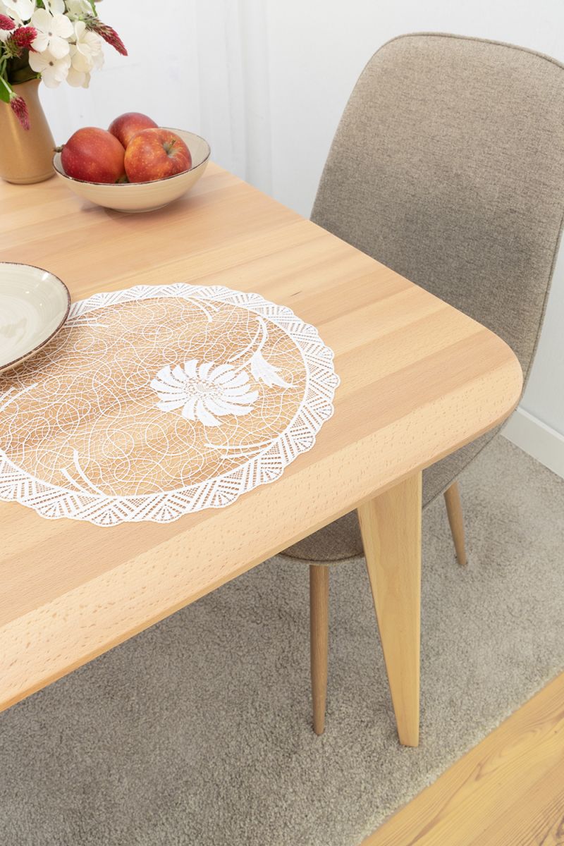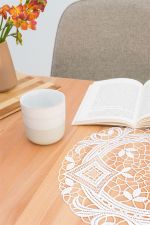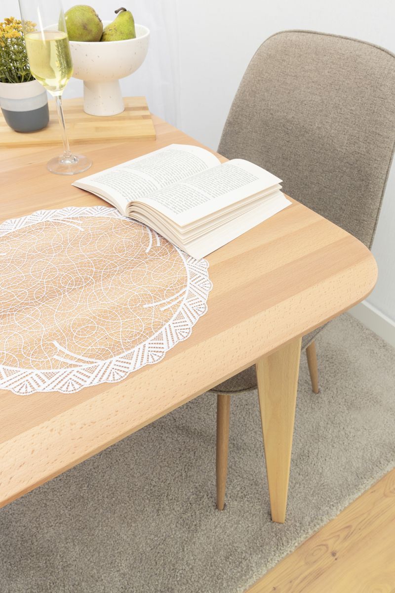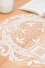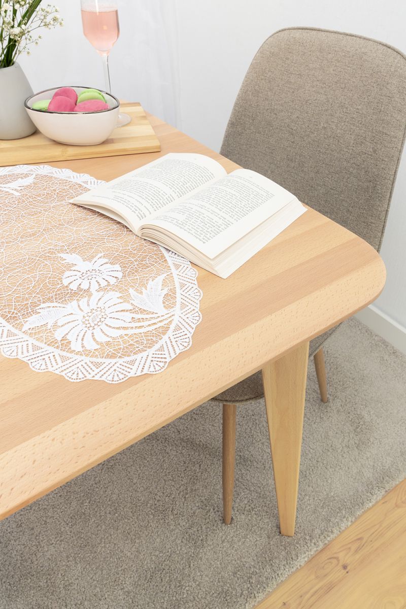 Diese runde textile Tischdekoration lässt als Basis ein großmaschiges Geflecht erkennen, das verschiedene Elemente zum Vorschein bringt. Längliche, geschwungene und abstrakt gestaltete kleinere Blätter sind beispielsweise in der äußeren Umrandung zu finden. Ein gemustertes kreisförmiges Band, das große Rautenformen mit verschiedenen Mustern integriert, scheint den äußeren und den inneren Bereich zu trennen. Dort setzt sich das luftige Maschengeflecht fort und dort hinein wurden weiterhin modern gestaltete Blätterformen integriert, die sich harmonisch in das unifarbene Design einfügen. Diese Art von Tischdeko aus Plauener Spitze® haben wir als Tischdecke, Tischläufer, Tischband und kleines Deckchen im Sortiment.