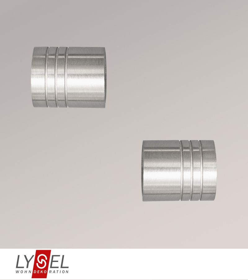 Diese Endstücke aus Metall haben die Form eines Zylinders und können auf Topaz Gardinenstangen sowie andere Gardinenstangen mit einem Durchmesser von 16 mm einfach aufgesetzt und genauso rückstandslos und ohne weitere Hilfsmittel wieder entfernt werden. Die Endstücke mit einer Länge von 2,6 cm sind außerdem mit drei ringförmigen Einkerbungen verziert. Auch wenn das reduzierte Design und die geometrische Form besonders gut in moderne Wohnumgebungen passt: Diese Endstücke können sich in viele Wohnstile stimmig einfügen.