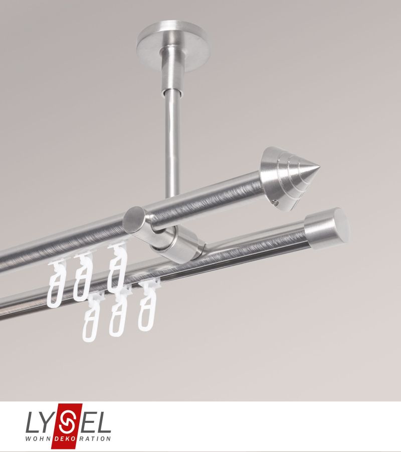 Lysel - SET Topaz 2-Lauf Universal Deckenträger offen 640cm Innenlauf mit Endstücke Kegel in Edelstahl-Optik #1W