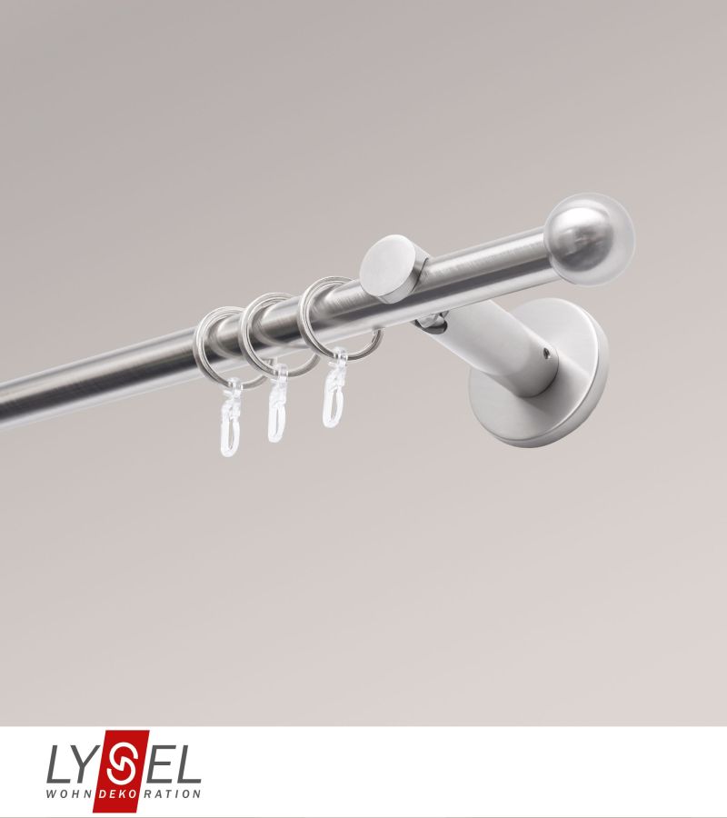 Dieses einläufige Set fällt vor allem durch die kugelförmigen Endstücke auf. Ebenso wie die Gardinenstange sind auch die Abschlüsse aus Metall. Die Fixierung an der Stange erfolgt durch einfaches Aufstecken. Die offenen Träger mit Metallmontageplatte werden inkl. Befestigungsmaterial geliefert und fest mit der Wand verschraubt. Auf diese Weise wird auch die Gardinenstange mit den Trägern verbunden, wahlweise mit der Öffnung nach oben oder unten. Zudem umfasst dieses Set Gardinenringe mit Gleiteinlage sowie Kunststoffhaken, an welchen beispielsweise ein mit Gardinen- oder Kräuselband ausgestatteter Vorhang aufgehängt werden kann. Auf Wunsch kürzen wir die Stange gern für Sie auf die passende Länge.