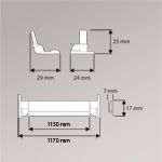 Das Klebeleisten-Set aus Kunststoff und Metall enthält zwei Klebeleisten und vier Spannschuhträger. Die Spannschuhaufnahmen sind flexibel und passen sich dem Winkel der Glasleiste an. Die Klebeleisten verdecken die Gummidichtung und haften sofort nach Anbringung, eine Korrektur der Position ist nicht möglich. Die volle Klebekraft wird nach 72 Stunden erreicht, die Plisseemontage kann nach 24 Stunden begonnen werden.